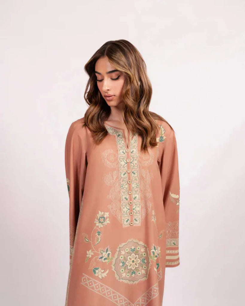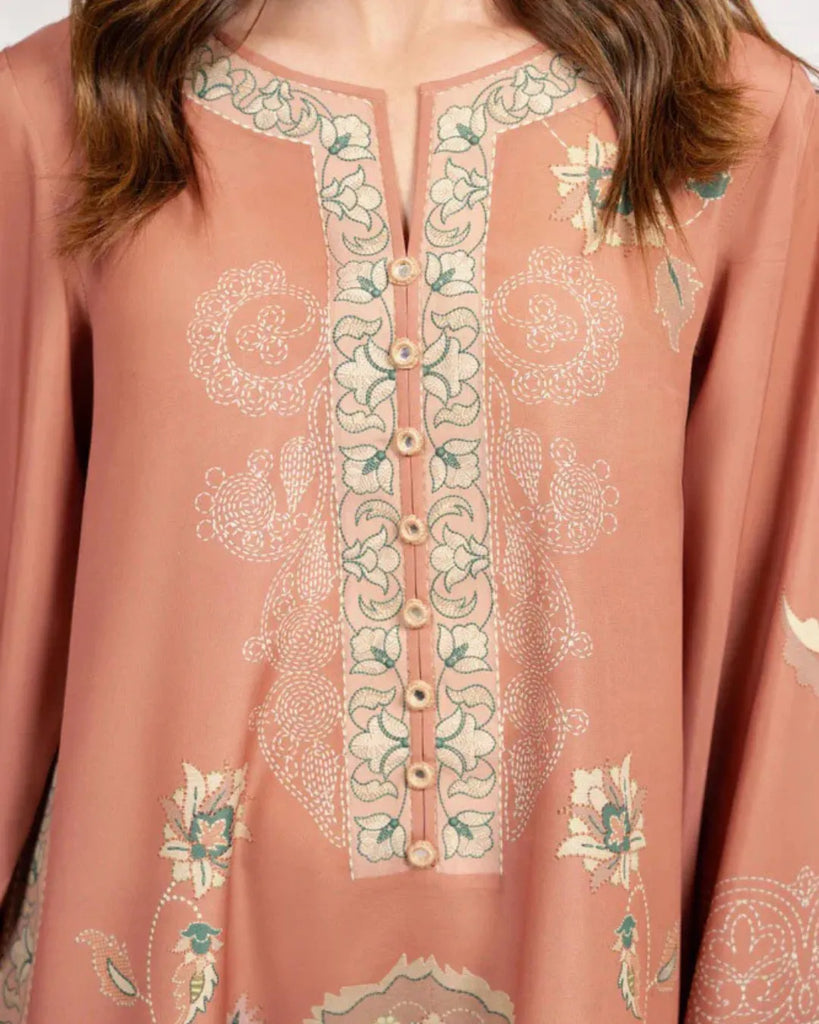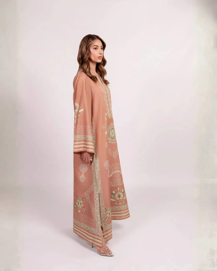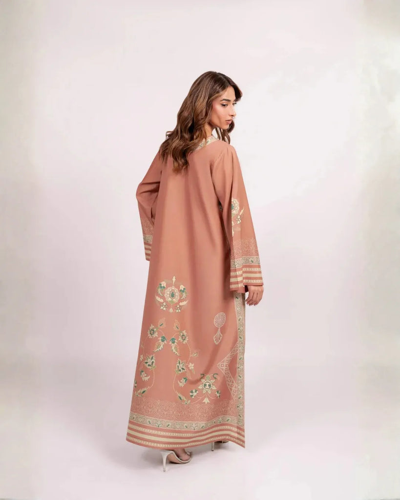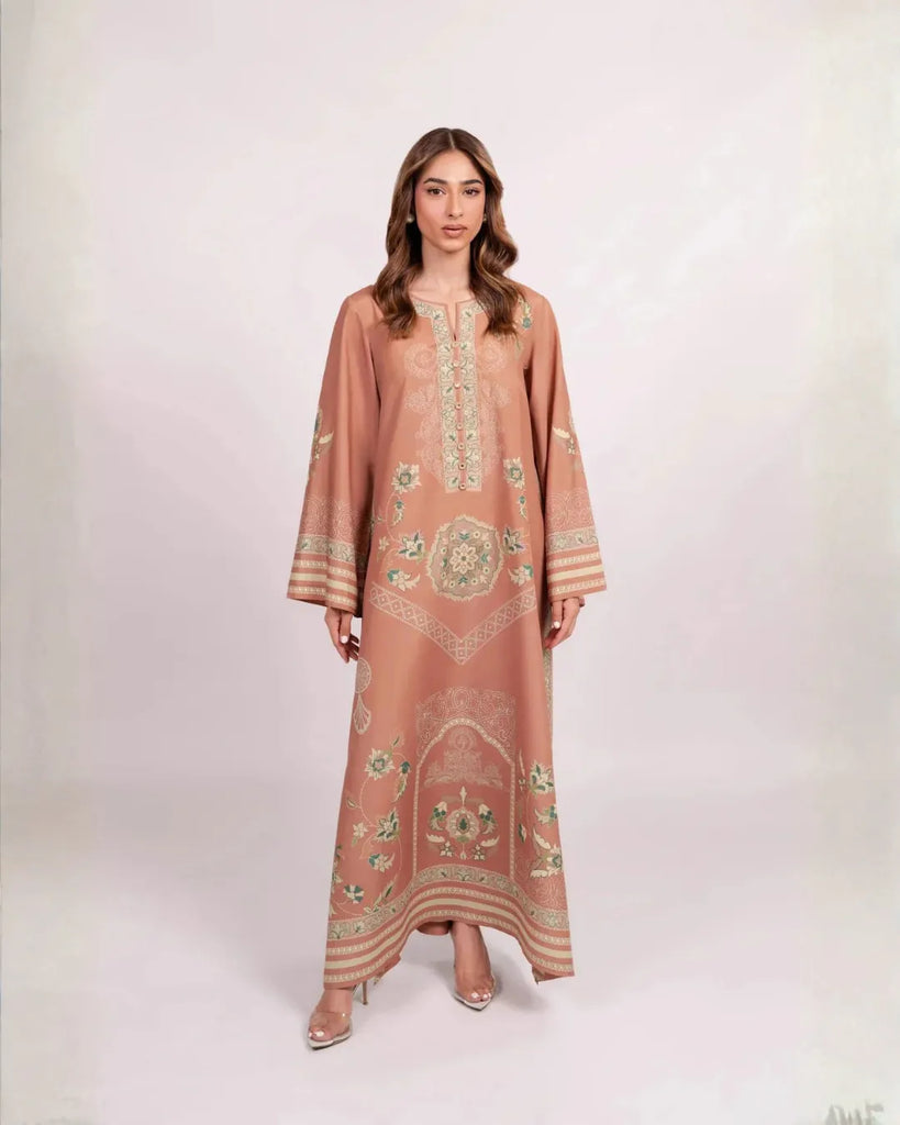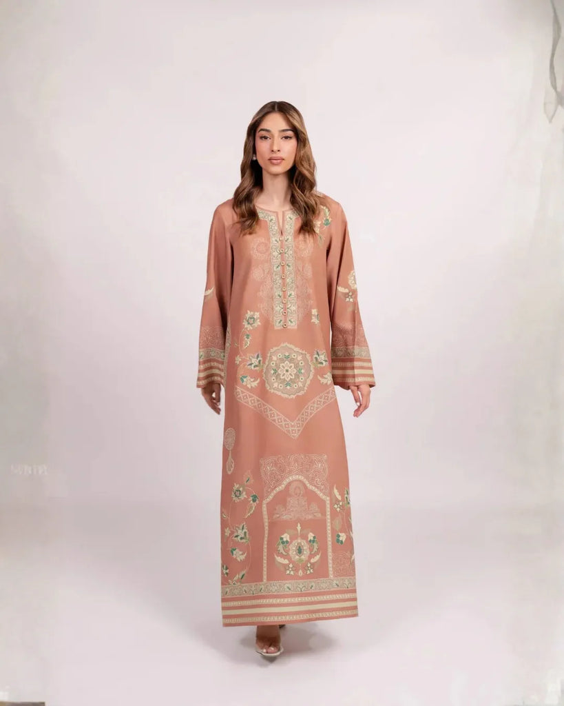 Elevate your everyday with this blush-terracotta kaftan, crafted from a luxurious cotton silk blend that offers both breathable softness and an elegant, subtle sheen. Intricate sage, ivory, and mint motifs unfurl across the garment—delicate medallions, floral vines, and lace-inspired borders lending an artful yet contemporary feel.