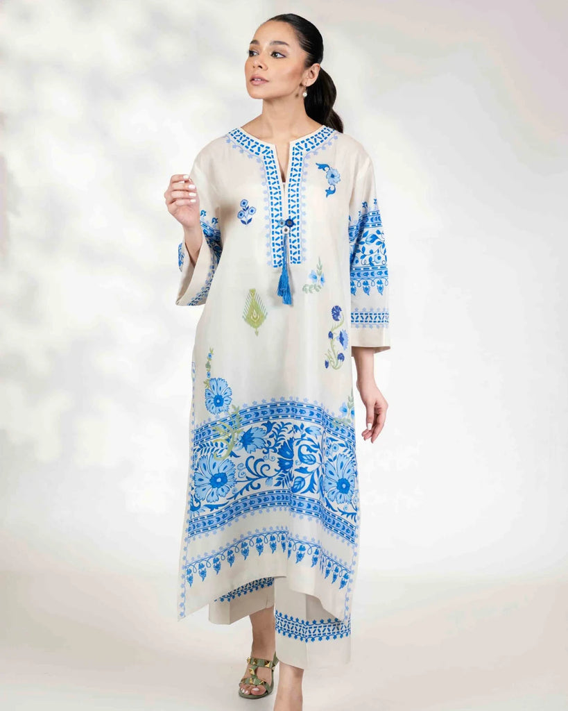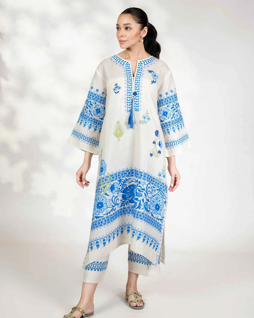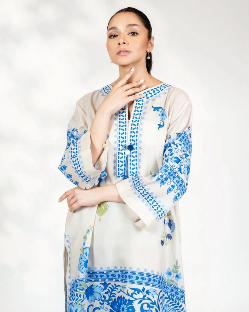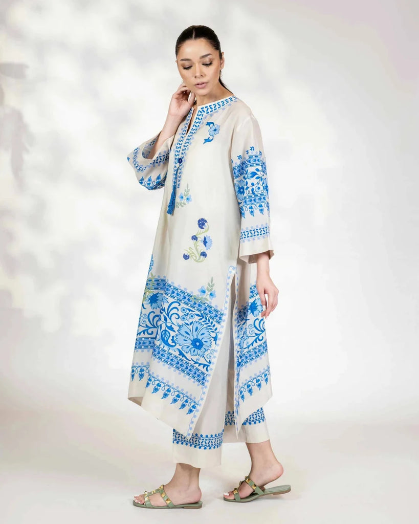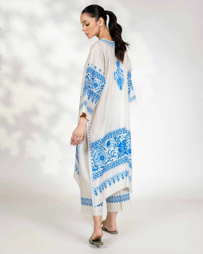 Brighten your day with our Orielle Co-Ord Set, designed to capture the effortless charm of bright days. The set features cool ivory fabric adorned with vibrant blue floral block prints and delicate leafy accents, delivering a fresh and uplifting look for any occasion.