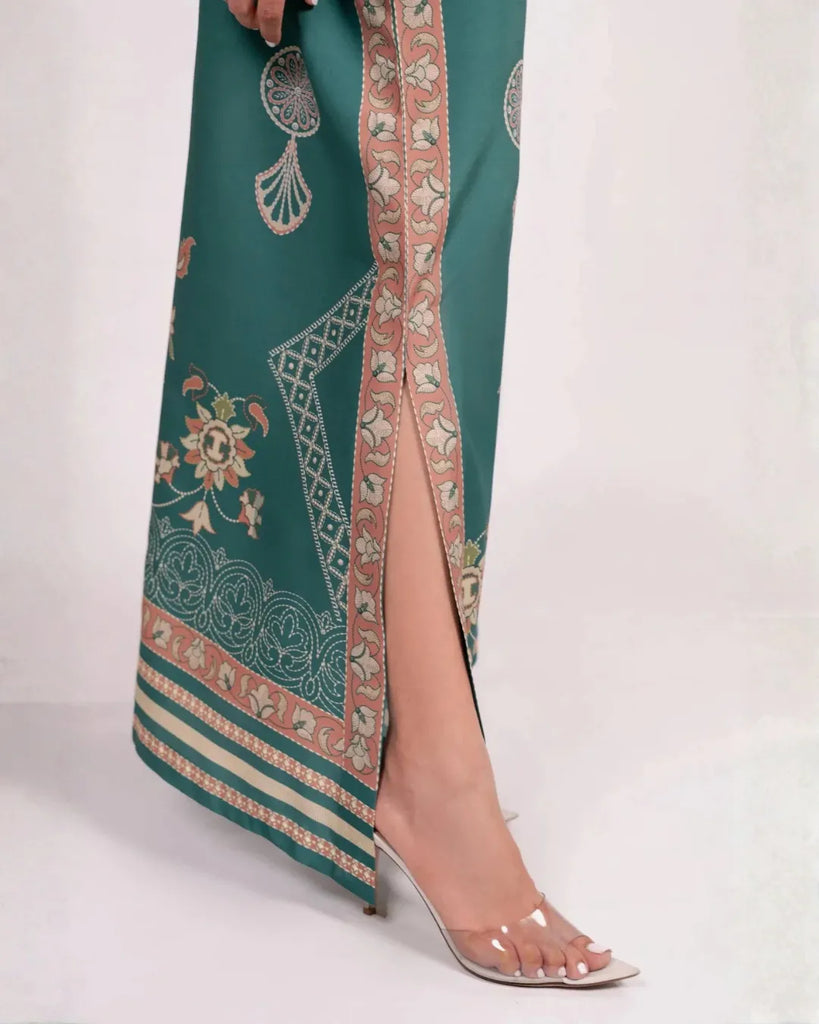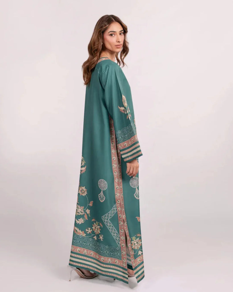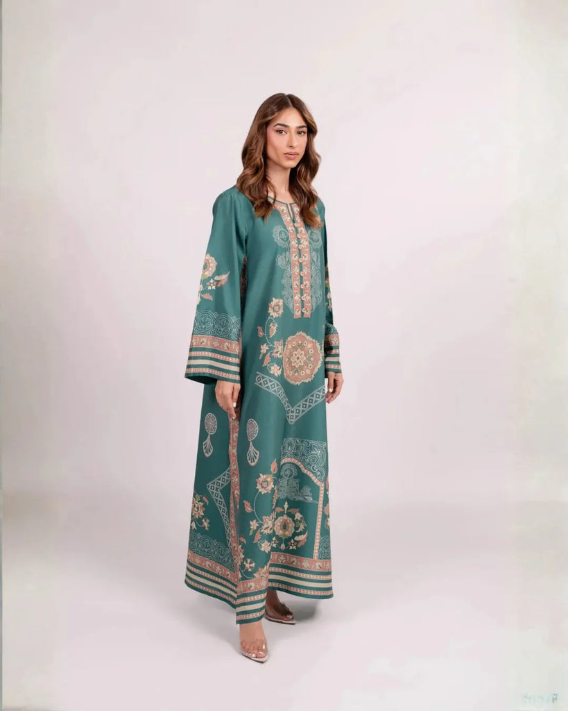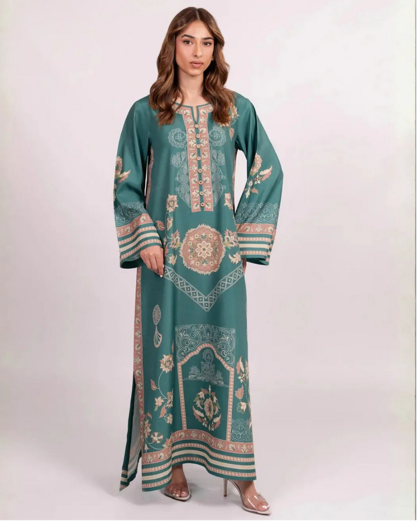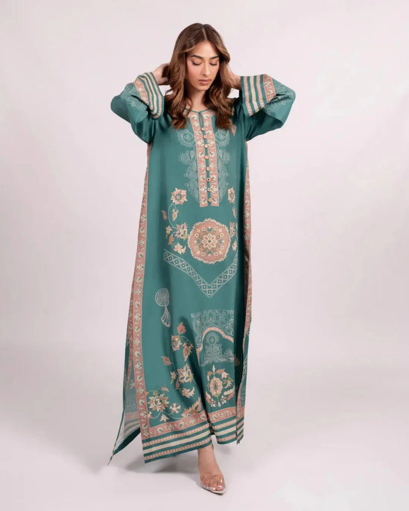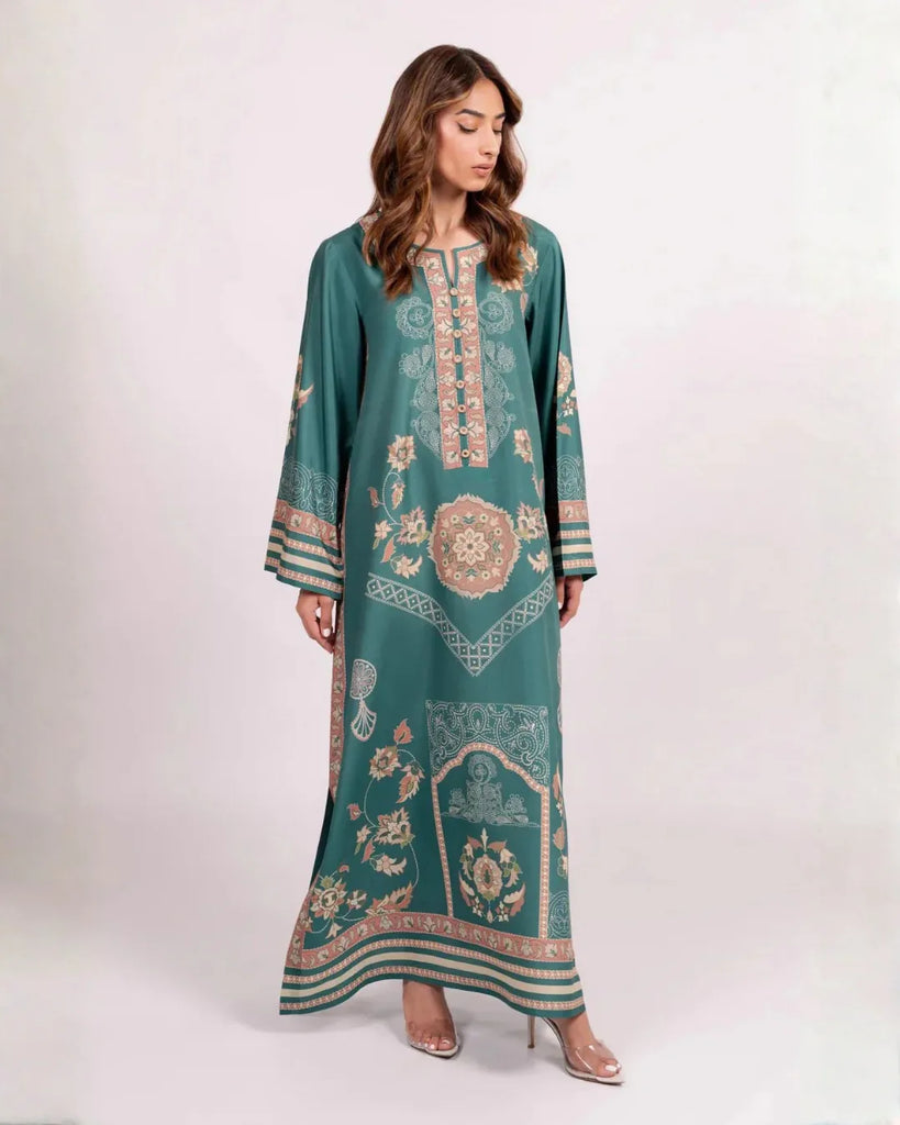 Celebrate refined elegance with the Eden Sarai Kaftan Dress, crafted in a lush, cotton silk blend for a sumptuously soft hand-feel and understated sheen. Its deep verdant base is adorned with delicate blush and ivory botanical medallions, traditional floral lattice, and ornate antique-inspired borderwork, delivering timeless cultural beauty with a contemporary, artful spirit.