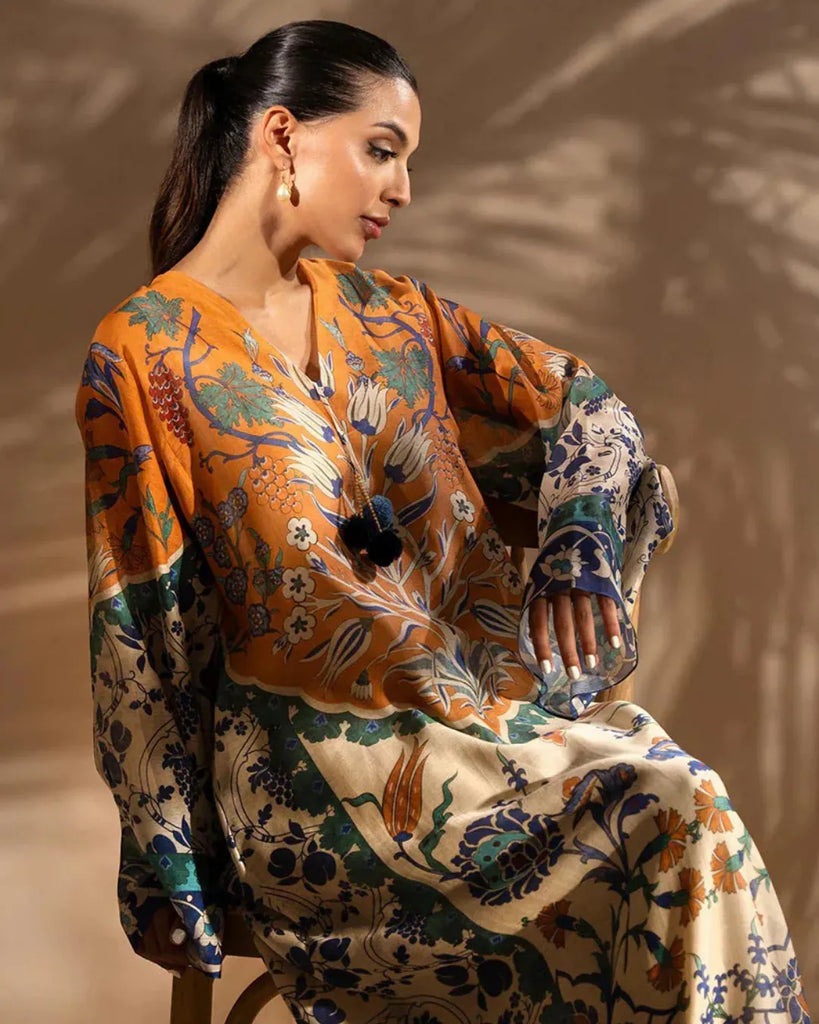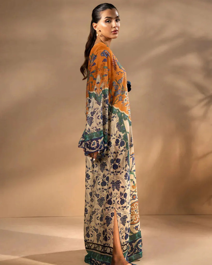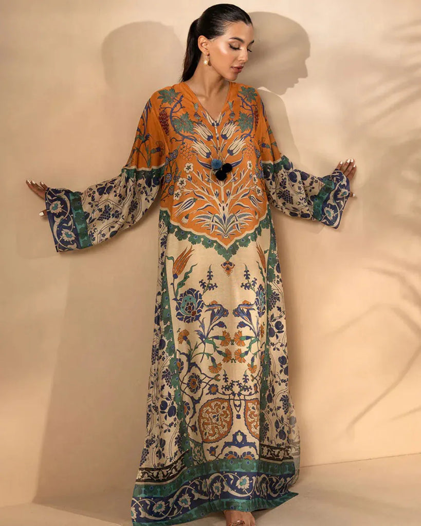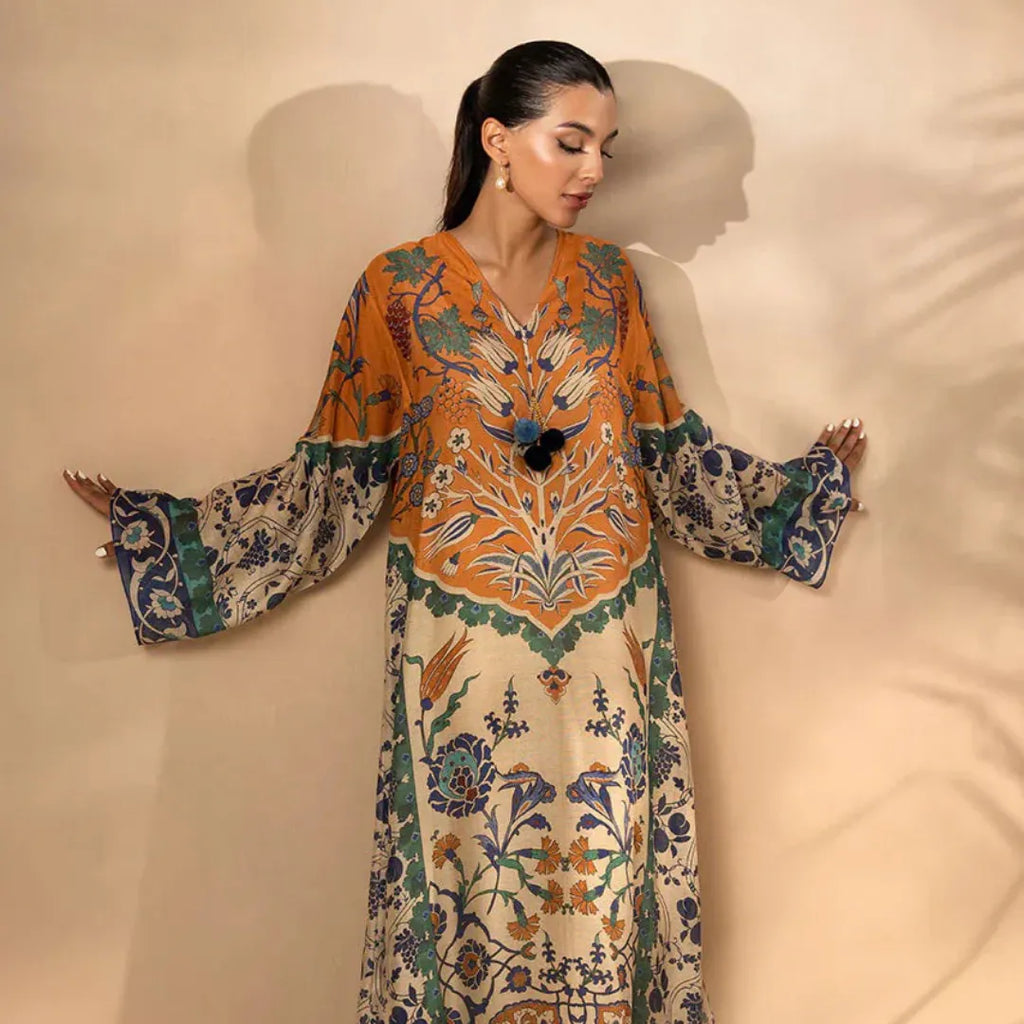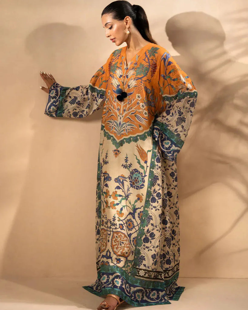 Step into understated elegance with the Sienna Grove Kaftan Dress—a canvas of flowing, modern comfort and rich botanical charm. Warm ochre, deep blue, and lush green blooms are artfully placed on weightless ivory fabric, bordered with intricate mosaics for a touch of quiet luxury. The roomy kaftan silhouette, relaxed sleeves, and sophisticated side slit deliver both movement and ease, while the striking print brings effortless allure to every moment.