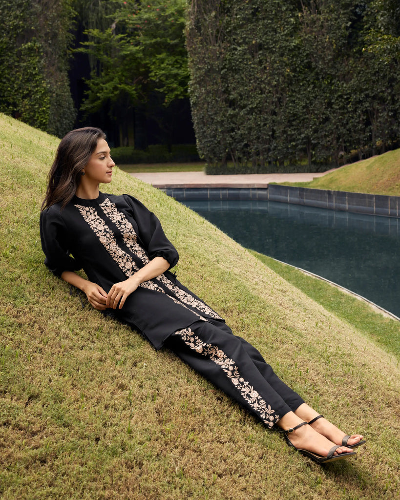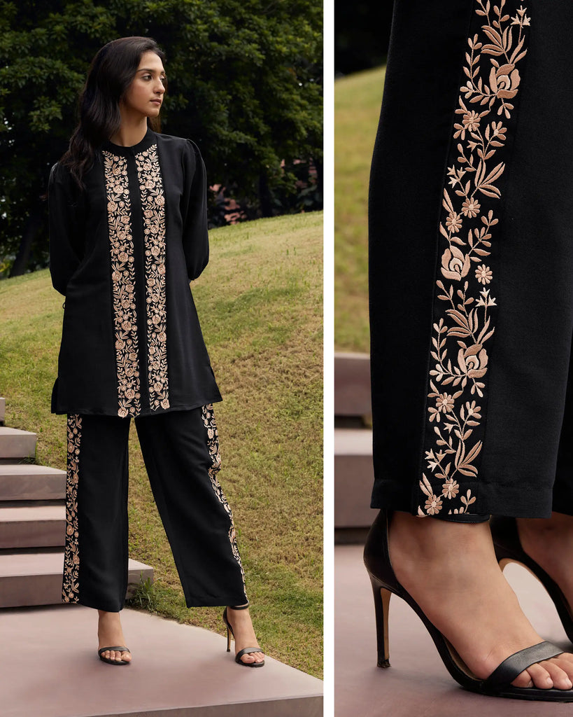 Step into elegance with our exquisite Co-ord Sets, crafted from fine viscose pure Chanderi silk fabric. These luxurious sets are adorned with intricate machine embroidery and delicate handwork, creating a perfect blend of tradition and modernity.
