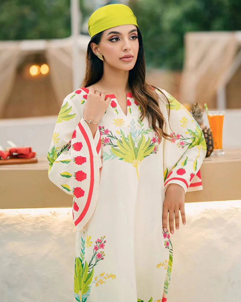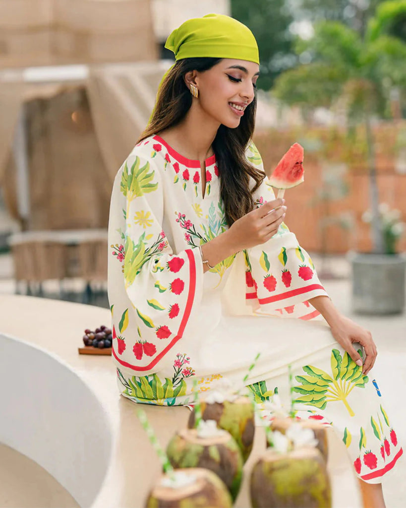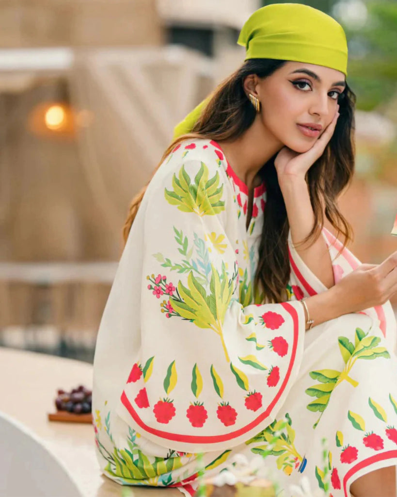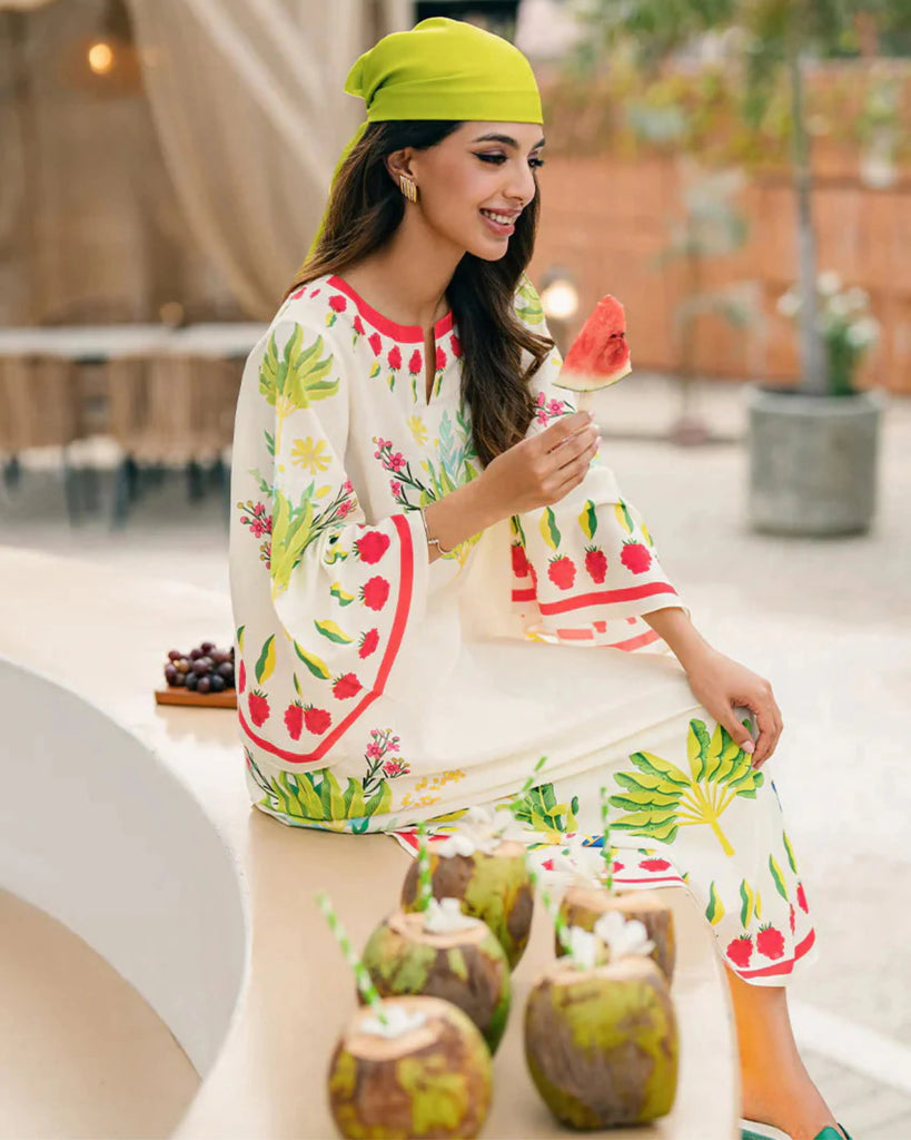 Bask in the effortless charm of the Solara Eden Co-Ord Set, where breezy sophistication meets playful artistry. This luxe cream ensemble is adorned with vibrant botanical prints in lush greens, sunshine yellow, and zesty strokes of watermelon pink along dramatic bell sleeves and side-split hems—instantly transporting you to sun-dappled gardens and summer escapes.