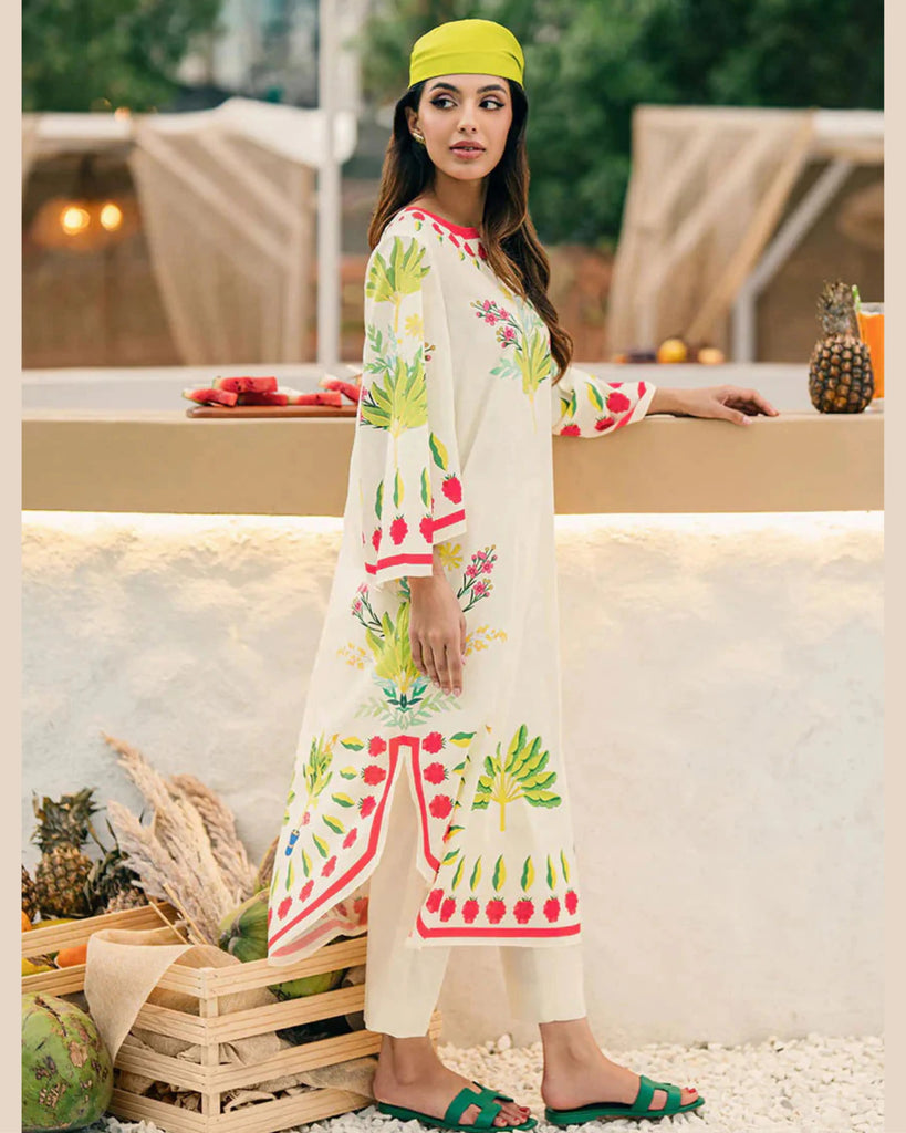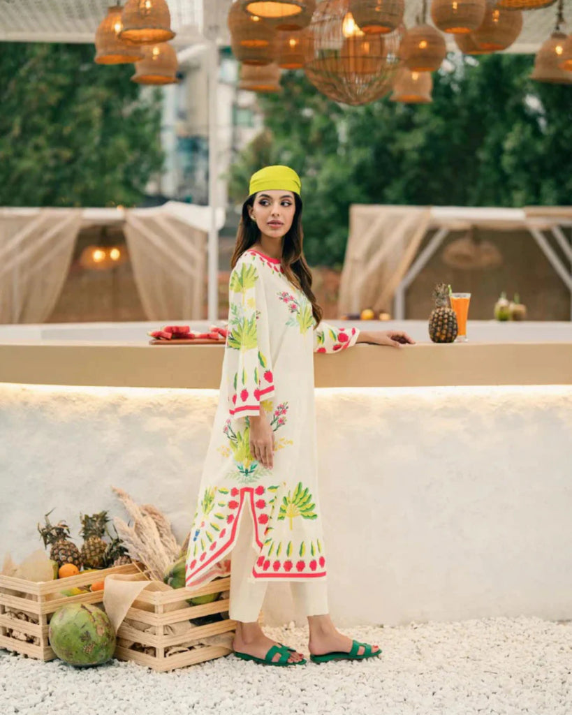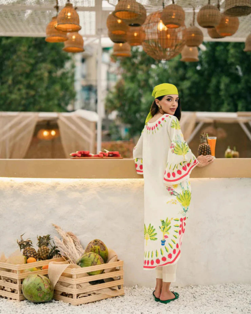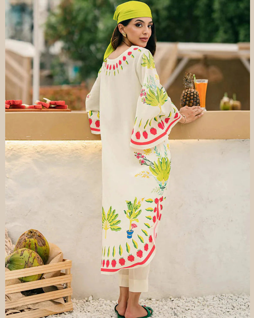 Bask in the effortless charm of the Solara Eden Co-Ord Set, where breezy sophistication meets playful artistry. This luxe cream ensemble is adorned with vibrant botanical prints in lush greens, sunshine yellow, and zesty strokes of watermelon pink along dramatic bell sleeves and side-split hems—instantly transporting you to sun-dappled gardens and summer escapes.