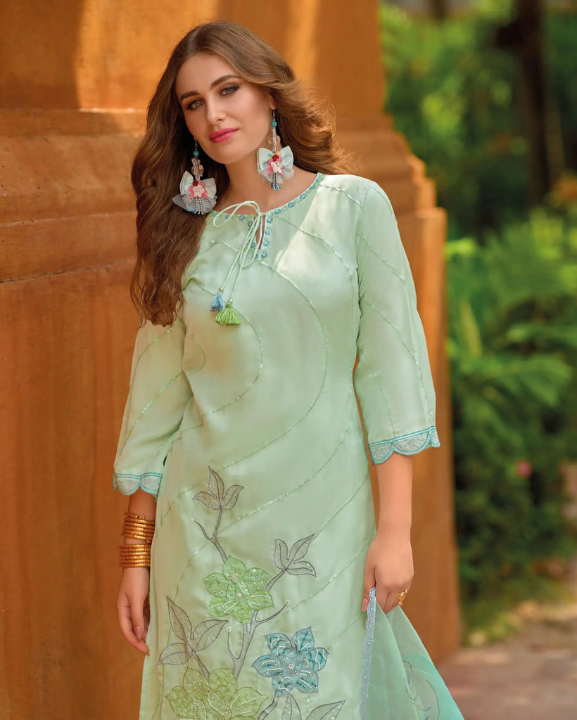 Experience elegance with this exquisite ethnic wear ensemble. The pure cotton top features a fully lined cotton inner with sleeves, adorned with designer fancy thread and handwork, plus intricate accessory detailing. The pure cotton bottom pant, highlighted with lacework, ensures comfort and style. Completing the look is a pure organza dupatta with designer prints. Fully stitched for convenience, this ensemble is perfect for festive occasions and special events, offering a seamless blend of tradition and modernity.