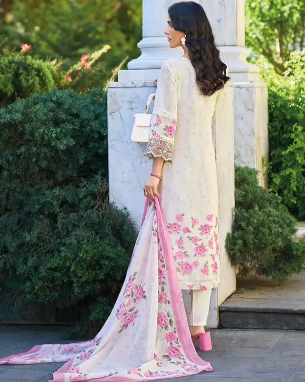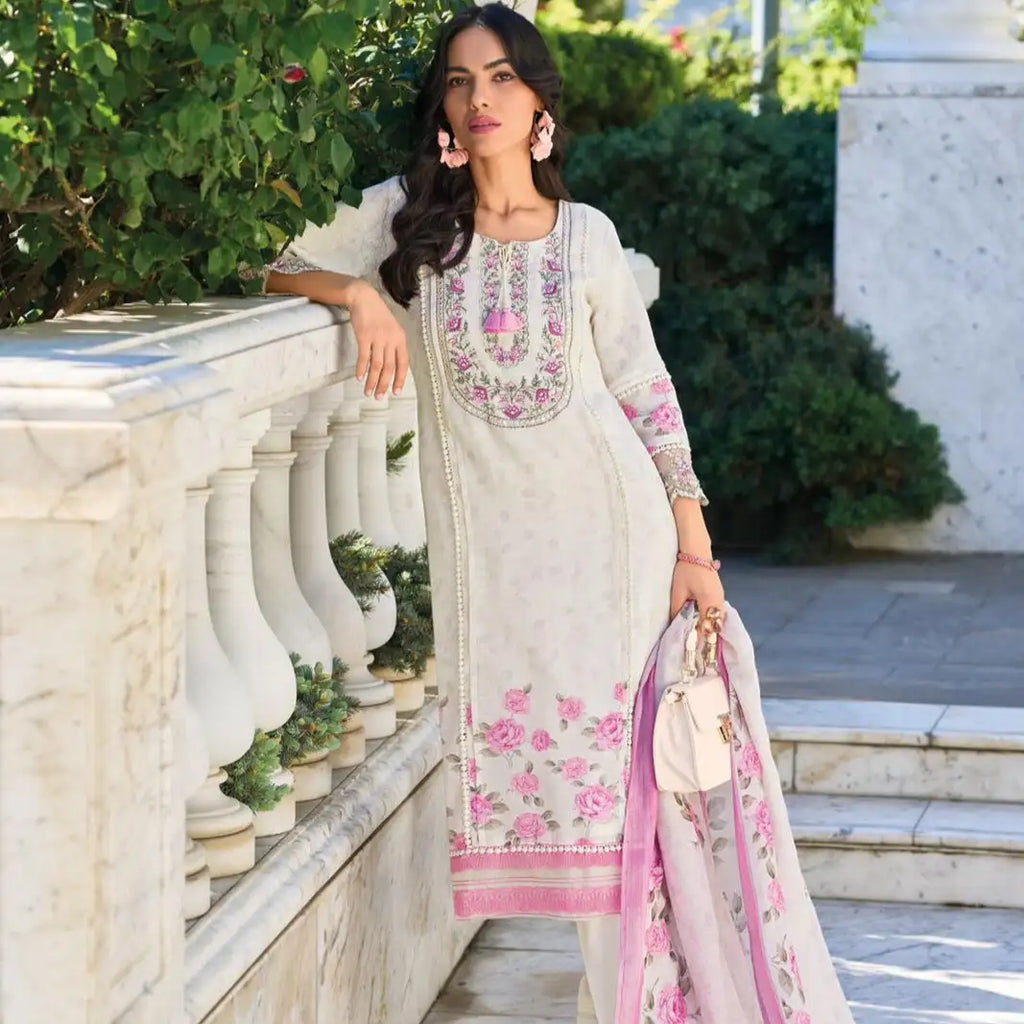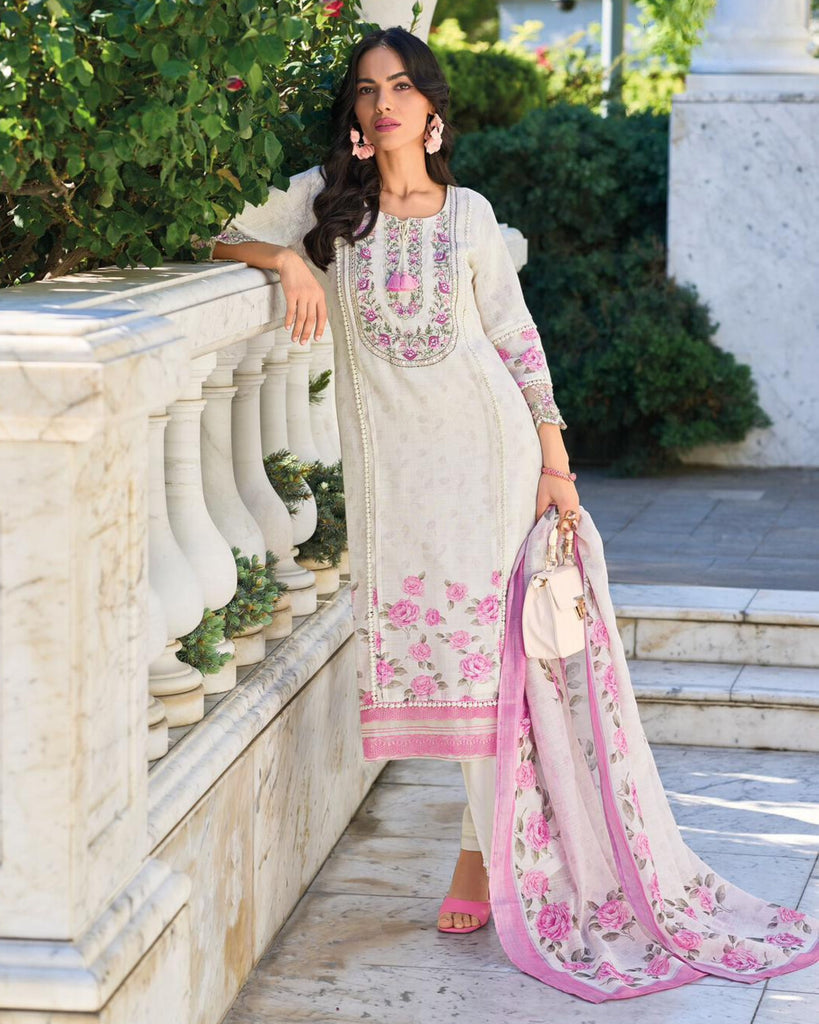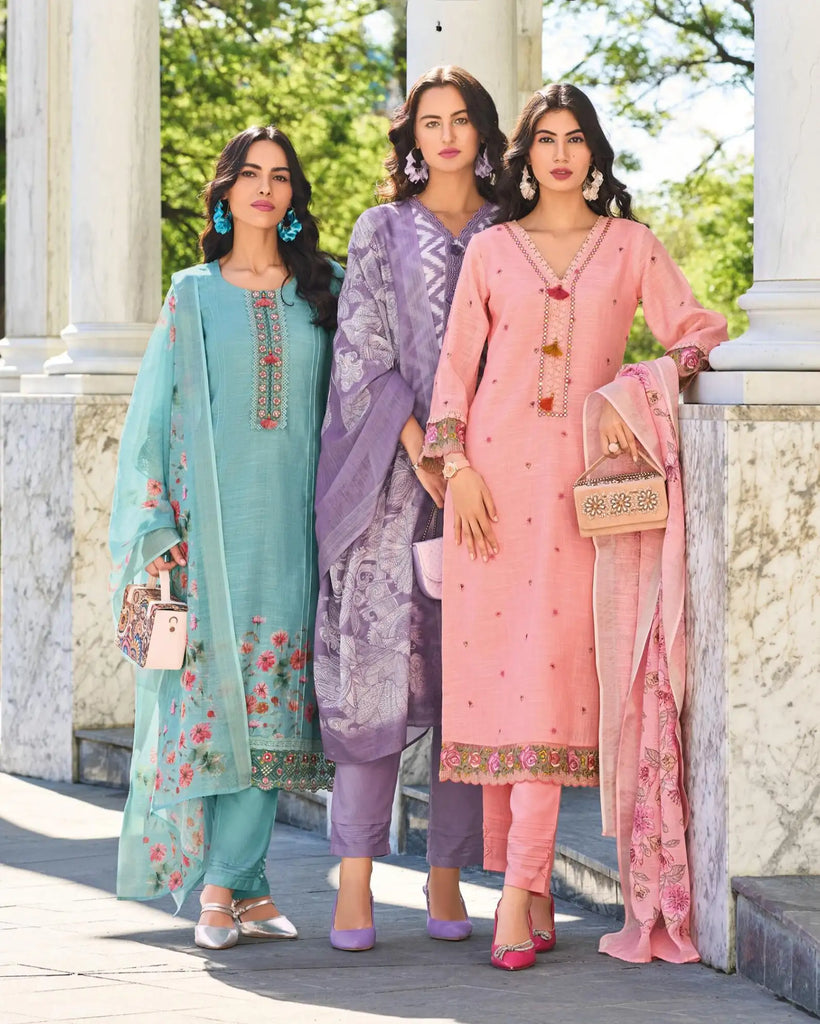 Embrace elegance with this ethnic wear ensemble. The pure linen kurta features intricate embroidery, a scalloped hemline, and bell sleeves. Paired with embroidered pure rayon trousers and an elasticated waistband, it ensures style and comfort. The pure linen dupatta, adorned with zari prints and a taped border, completes the look. Fully stitched and ready to wear, this outfit is perfect for festive occasions and casual outings. Dry clean only.
