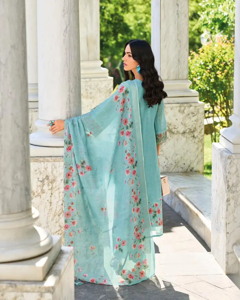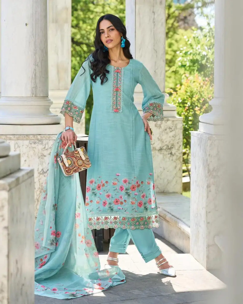 Embrace elegance with this ethnic wear ensemble. The pure linen kurta features intricate embroidery, a scalloped hemline, and bell sleeves. Paired with embroidered pure rayon trousers and an elasticated waistband, it ensures style and comfort. The pure linen dupatta, adorned with zari prints and a taped border, completes the look. Fully stitched and ready to wear, this outfit is perfect for festive occasions and casual outings. Dry clean only.