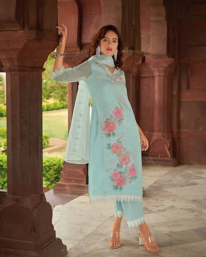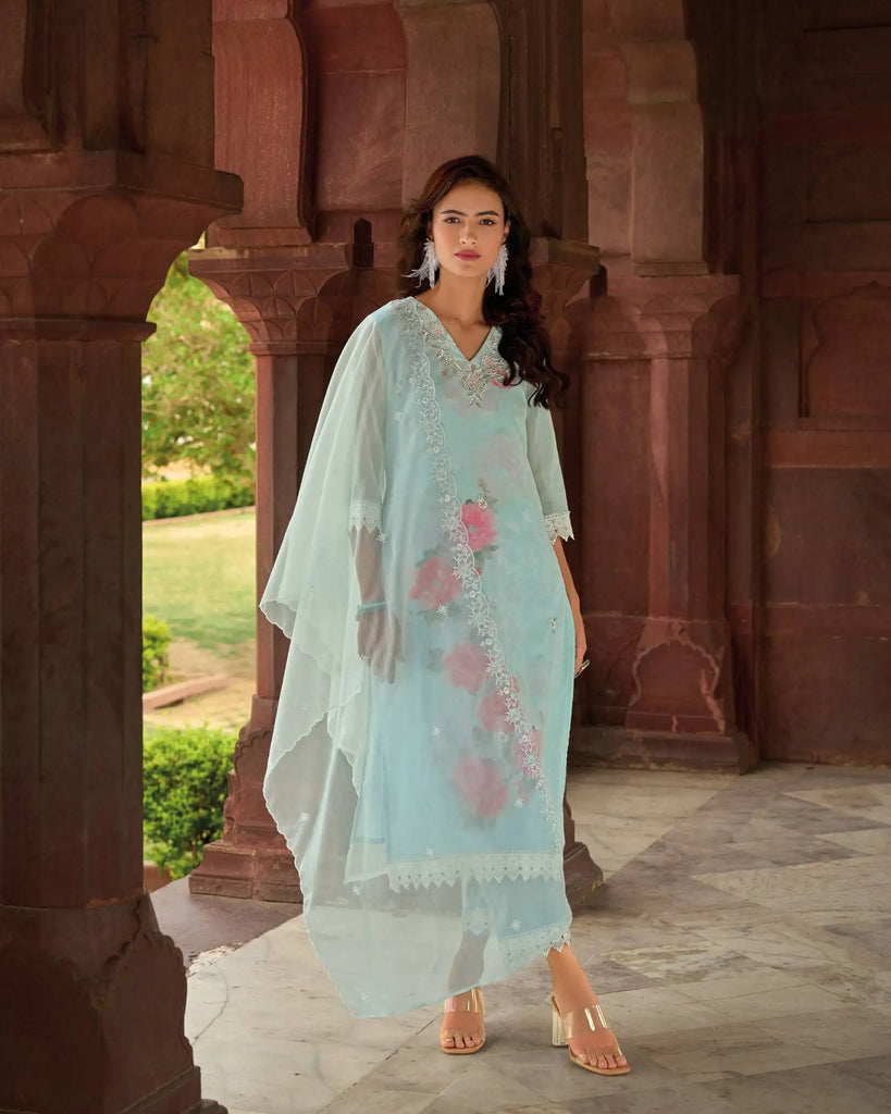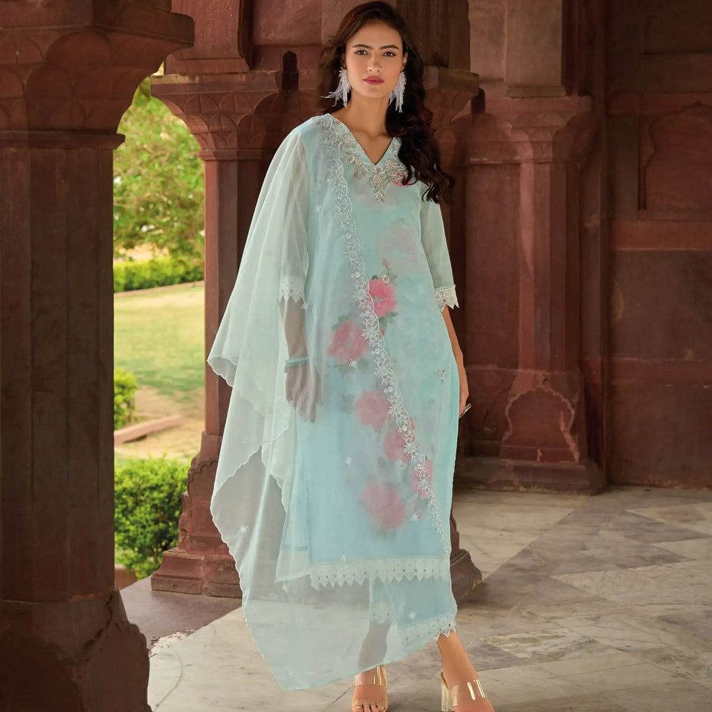 Discover the sophisticated charm of Silaihouse's 3-Piece Suit Set. The top kurta, made from opulent organza fabric, features detailed embroidery and lacework, along with a comfortable cotton lining.