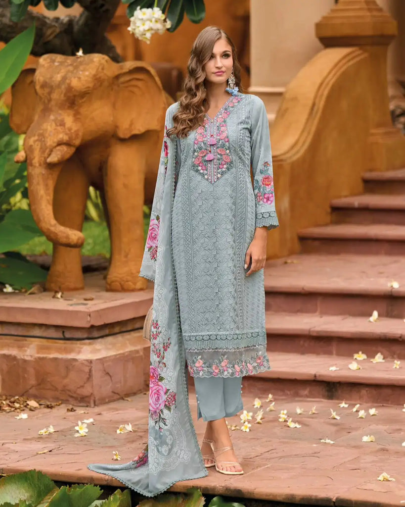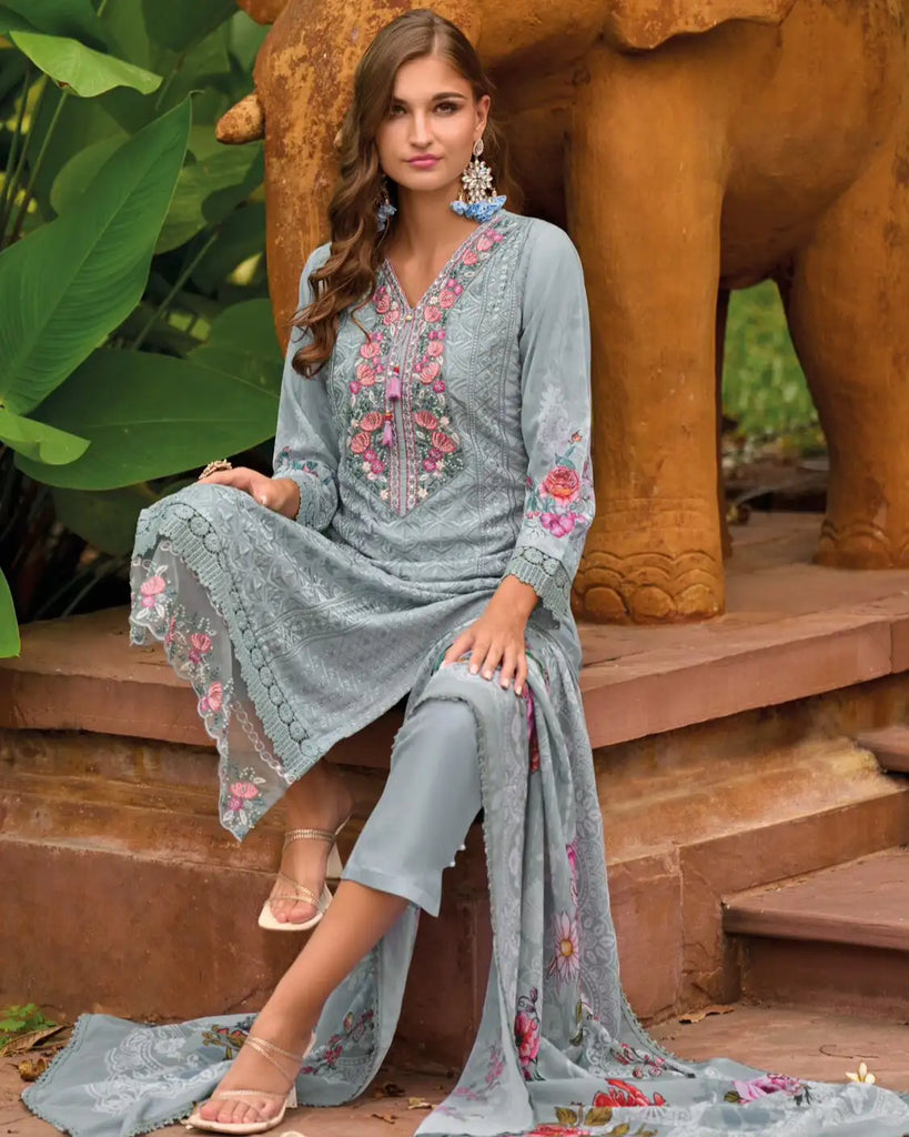 The Pure Designer Digital Print Sleeves adorned with delicate laces enhance the Kurti's sophistication. Complementing the Kurti, the Fancy Bottom in Pure Muslin offers a seamless blend of comfort and style. The ensemble is completed with a Pure Chinon Chiffon Dupatta featuring elegant scalping work and fancy muslin detailing, adding a luxurious finish to the outfit.
