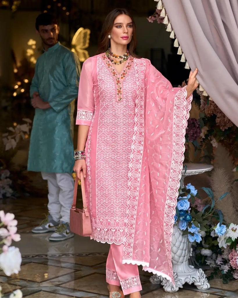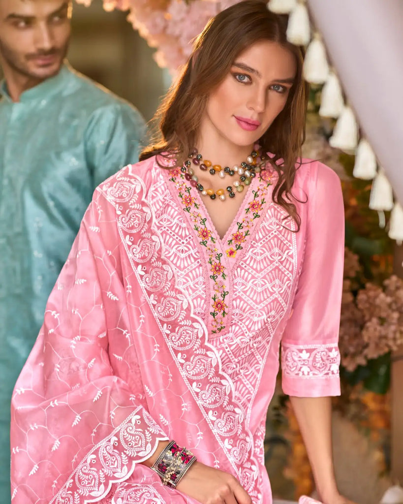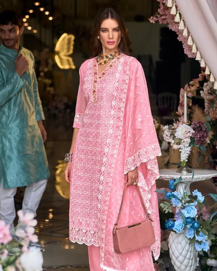 Dive into a realm of sheer elegance with SilaiHouse's Ethnic Ensemble. The top, adorned with intricate bored Schiffli work, delicate embroidery, and meticulous handwork on organza, exudes sophistication. Its inner lining ensures comfort without compromising on style.Paired perfectly, the bottom features a viscose pant embellished with a captivating lace pattern, adding a touch of allure to your ensemble.