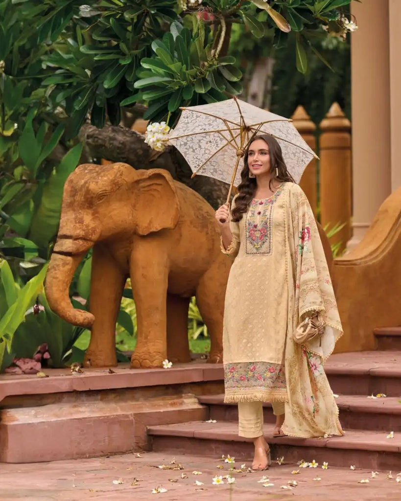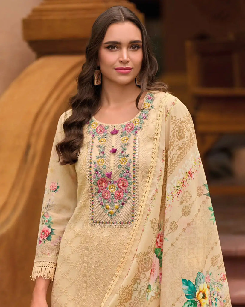 The Pure Designer Digital Print Sleeves adorned with delicate laces enhance the Kurti's sophistication. Complementing the Kurti, the Fancy Bottom in Pure Muslin offers a seamless blend of comfort and style. The ensemble is completed with a Pure Chinon Chiffon Dupatta featuring elegant scalping work and fancy muslin detailing, adding a luxurious finish to the outfit.
