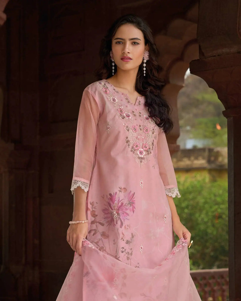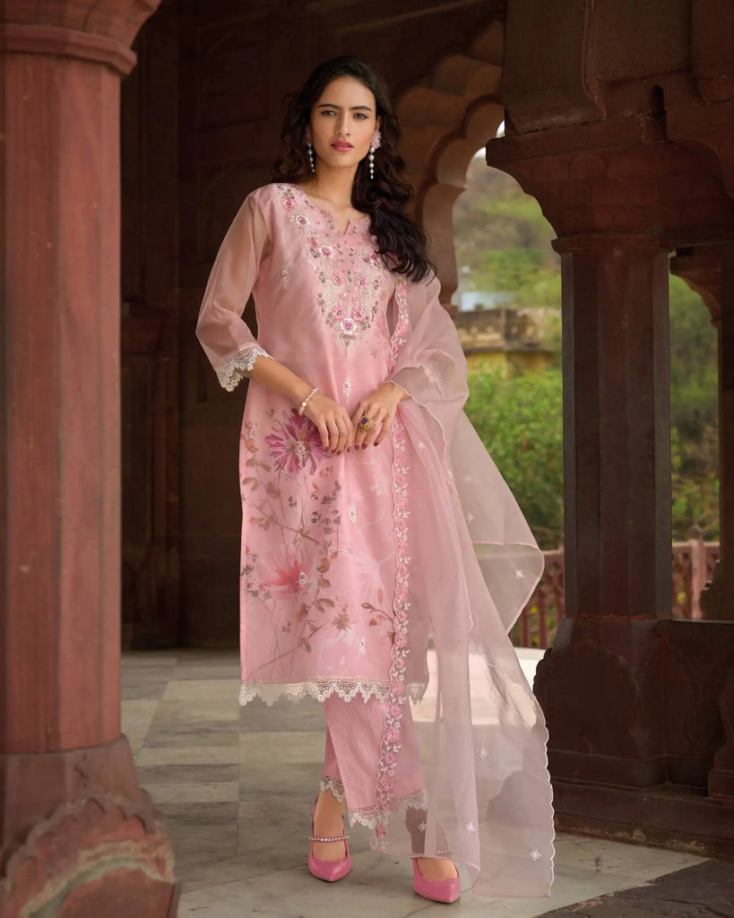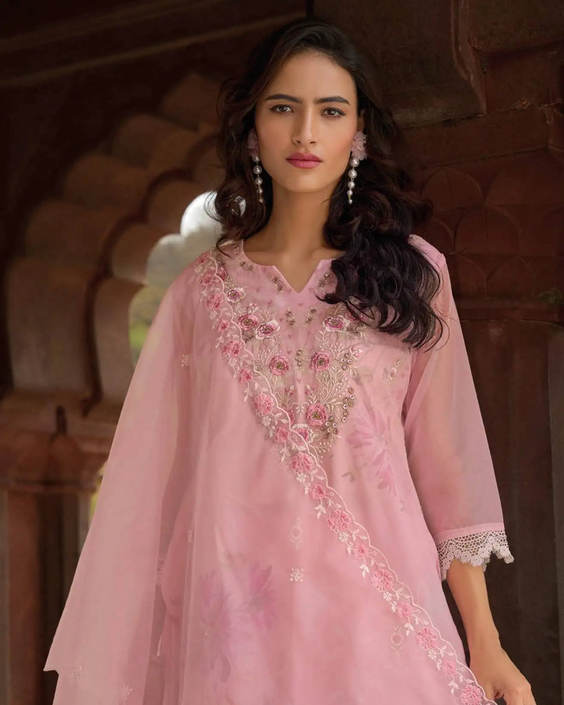 Elevate your ethnic wardrobe with our exquisite 3-piece suit set from Silaihouse. Crafted with finesse, the kurta features delicate hand embroidery and lacework on luxurious organza fabric. Its cotton inner lining ensures comfort all day long.