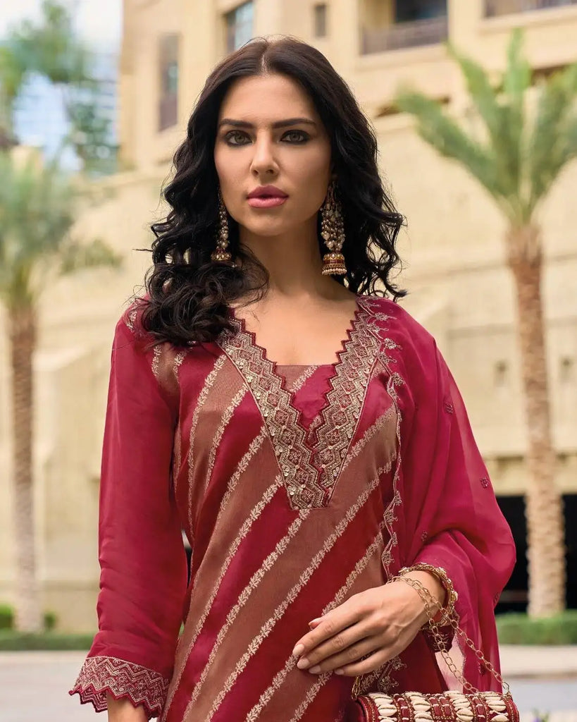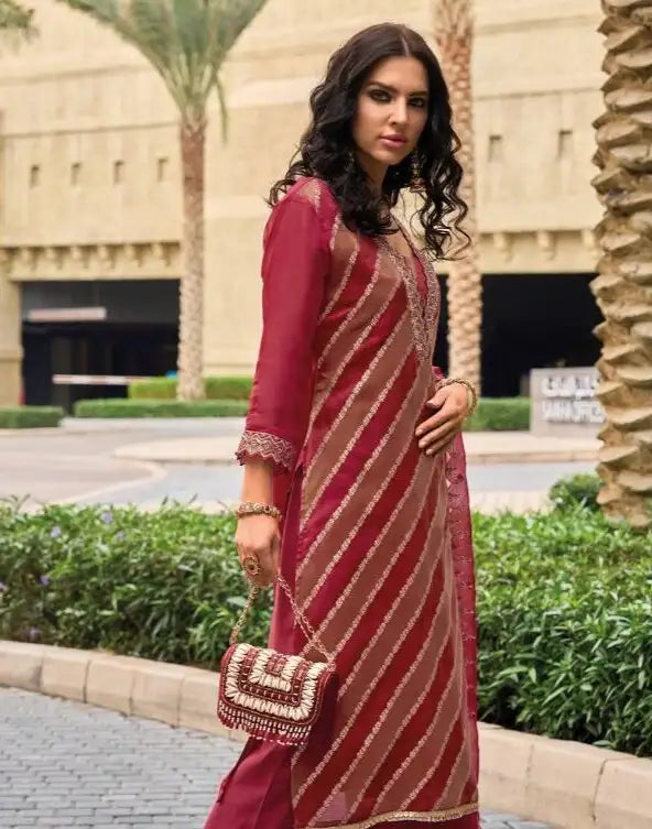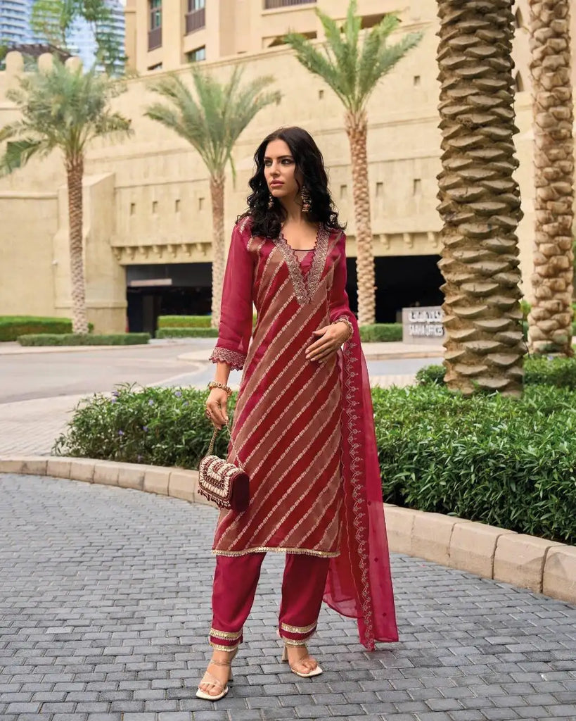 Elevate your ethnic wardrobe with our stunning 3-piece suit set, meticulously crafted to exude elegance and charm. Made from pure viscose shimmer organza fabric, the top features exquisite handwork embroidery and inner lining for both style and comfort. The bottom, crafted from viscose silk fabric, offers a graceful drape and practicality with its pockets.