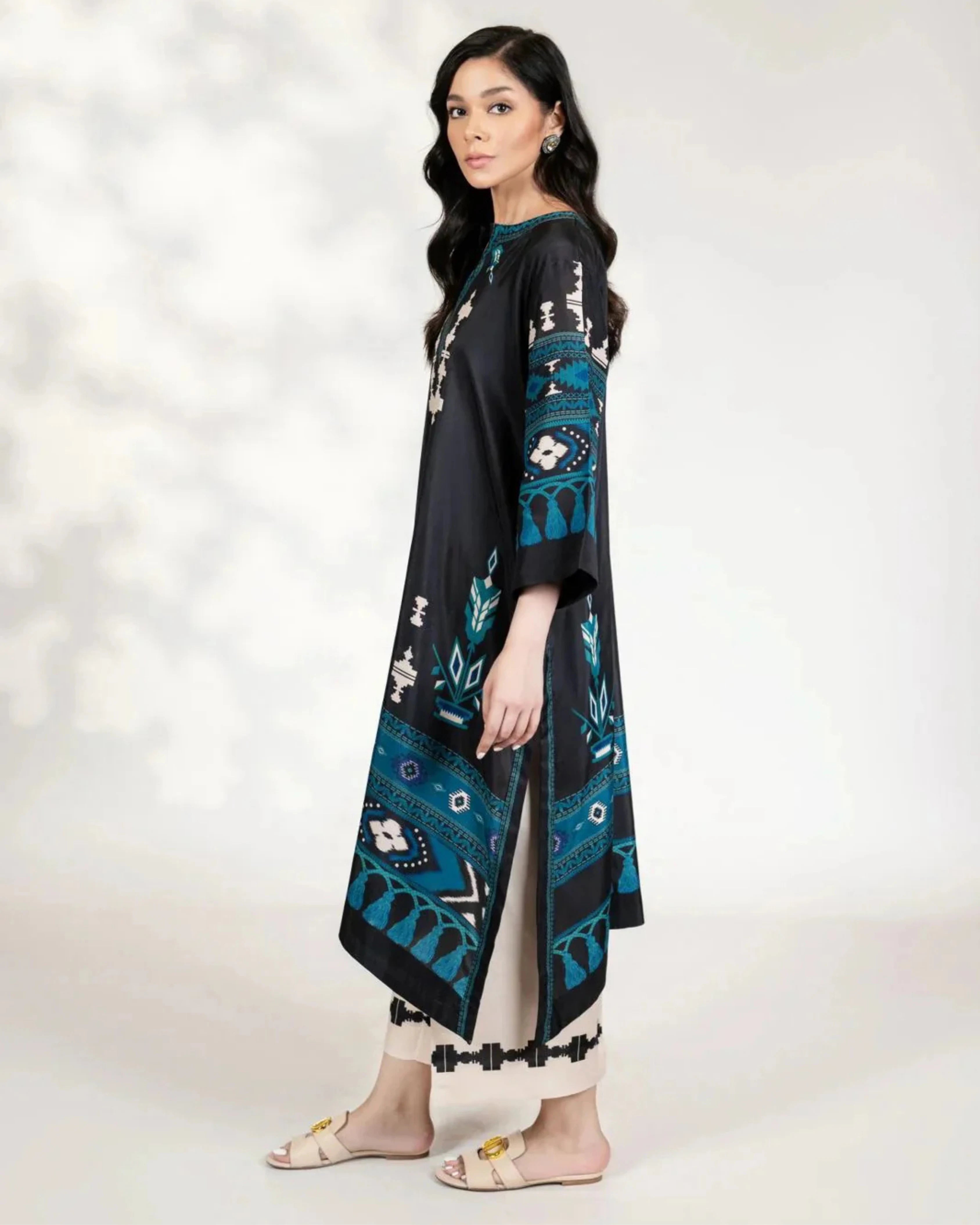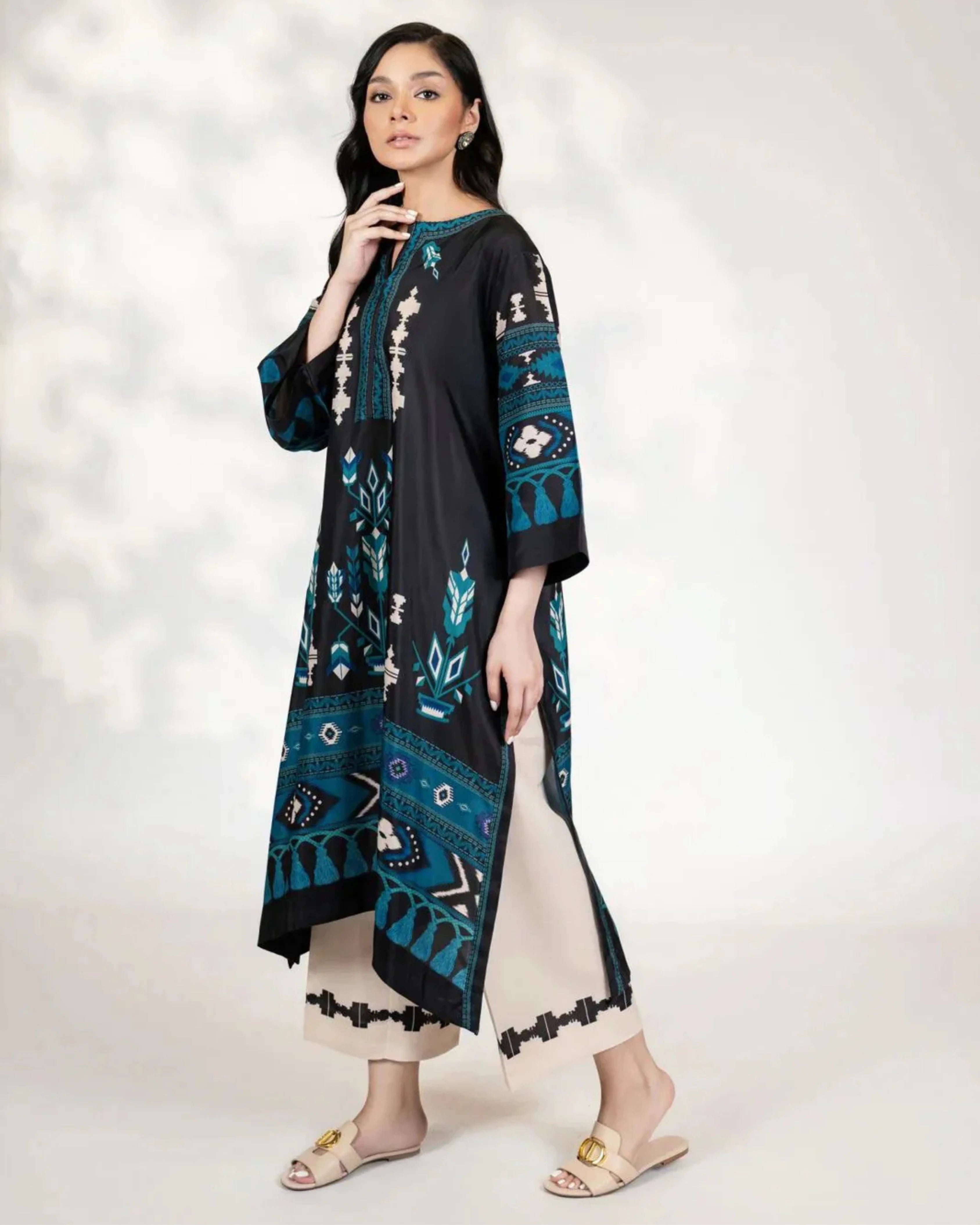 This elegant Aurea Plush coord set features a flowing black kurta enriched with intricate teal and ivory geometric and botanical prints that make a striking statement. Crafted from soft, breathable fabric, it offers a relaxed fit with an easy mandarin collar and side slits for graceful movement. The matching beige pants, adorned with complimentary black print borders, complete this sophisticated ensemble that perfectly complements modern ethnic wear wardrobes.