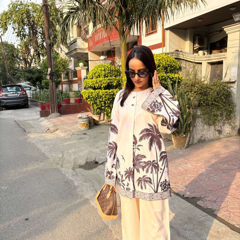 Step into bold sophistication with the Evania Co-Ord Set, crafted for those who seek a striking blend of comfort and statement style. This ensemble features a deep navy base splashed with stylized palm and tropical motifs in gentle hues of blush and sand, artfully arranged for a refined yet lively look.