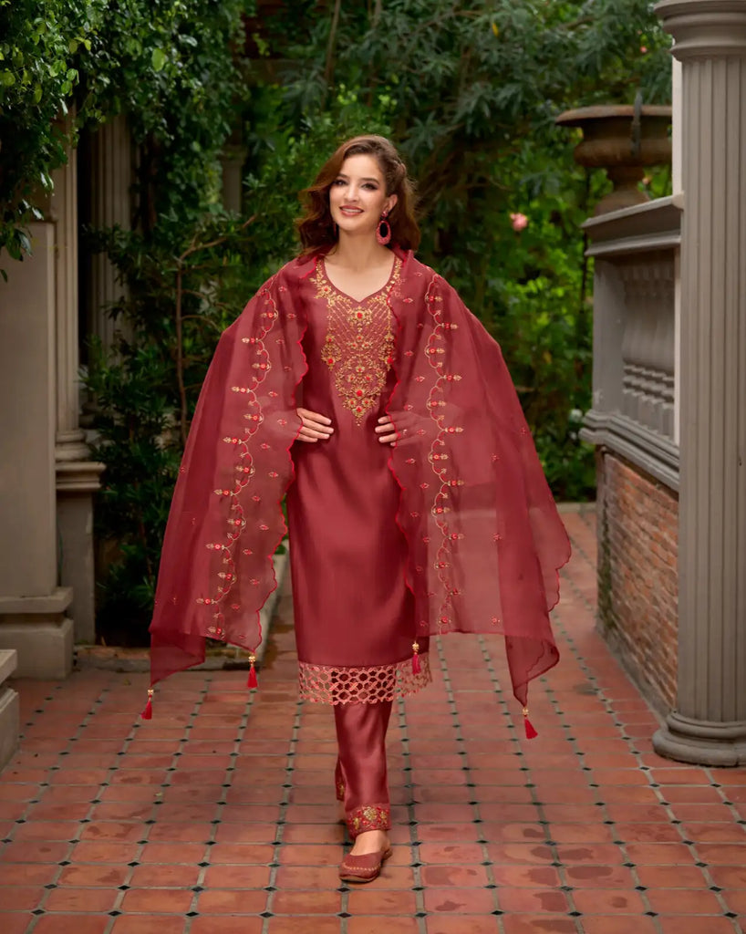 The bottom boasts intricate lacework, adding a touch of sophistication to your ensemble. Completing the look is the embroidered and cutwork organza dupatta, adorned with delicate tassels, elevating the ensemble's charm and grace.Indulge in the allure of traditional craftsmanship and modern sophistication with SilaiHouse's Ethnic Ensemble, perfect for weddings, festivities, and special occasions.